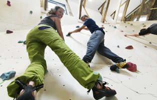 1.000 Klettergriffe bilden 70 unterschiedliche Routen in der neuen Boulderhalle, die von den insgesamt 450.000 Euro Sanierungskosten etwa 50.000 Euro verschlungen hat. Rund 10.000 Stunden ehrenamtliche Hilfe wurden geleistet – noch nicht eingerechnet der Zeitaufwand einer älteren NaturFreundin, die 1.500 Liter Kaffee und 120 Kuchen zubereitete, um die Handwerker „bei Laune“ zu halten. 900 Quadratmeter Holzplatten wurden eingebaut, 18.000 Löcher gebohrt und 13.000 Einschlagmuttern mit 26.000 Schrauben verschraubt. Die neue Boulderhalle bietet hervorragende Schulungsmöglichkeiten und ist auch für inklusive Kletterkurse sehr gut geeignet.