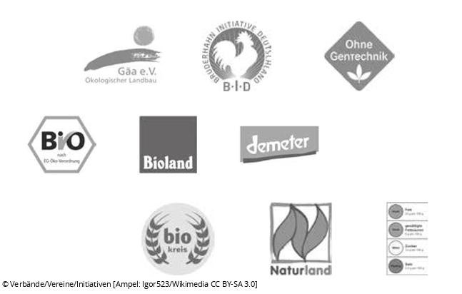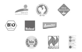 Die deutschen Bio-Verbände haben eigene, strengere Kriterien entwickelt, die deutlich über die Standards des EU-Bio-Siegels hinaus gehen. Ausgegeben werden die Siegel von Öko-Landbau-Verbänden wie Bioland, Demeter, Gäa, Biokreis, Neuland (5. bis 8. Siegel in Leserichtung) & Co. Zertifizierte Betriebe müssen komplett ökologisch arbeiten – einzelne Betriebszweige können nicht ausgenommen werden – und es werden wesentlich weniger Tiere je Hektar als beim EU-Siegel zugelassen. Das schont Tierwohl und Umwelt.