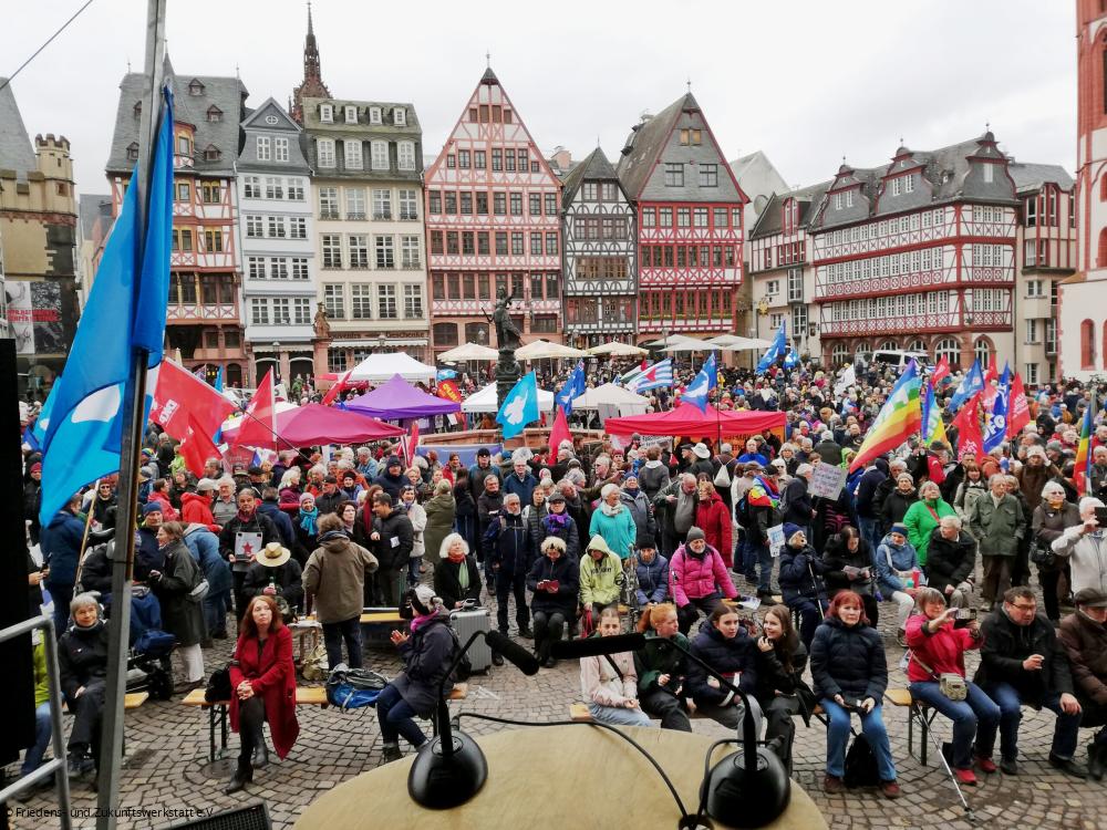 Es freut mich, dass ihr alle zum Ostermarsch auf den Frankfurter Römerberg gekommen seid. Noch mehr haben gestern Abend die Berichte gegeben, dass es in Israel machtvolle Demonstrationen gegeben hat: gegen das Regime von Netanjahu und für Neuwahlen, für die Freilassung der Geiseln und eine Friedenslösung in Gaza.