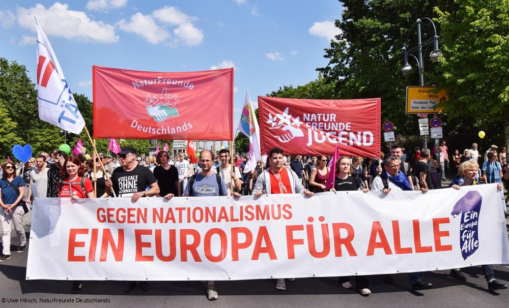 Eine Woche vor der Europawahl warben die Demonstrierenden in sieben deutschen (und mehr als 40 weiteren europäischen) Städten zudem für eine hohe Wahlbeteiligung. „Wir appellieren an alle Bürgerinnen und Bürger Europas: Geht wählen und tretet ein für ein demokratisches, friedliches und solidarisches Europa und gegen Nationalismus und Rassismus”, war eine zentrale Botschaft aus dem Trägerkreis, in dem die NaturFreunde sowie die Naturfreundejugend Deutschlands eine zentrale Funktion übernahmen.
