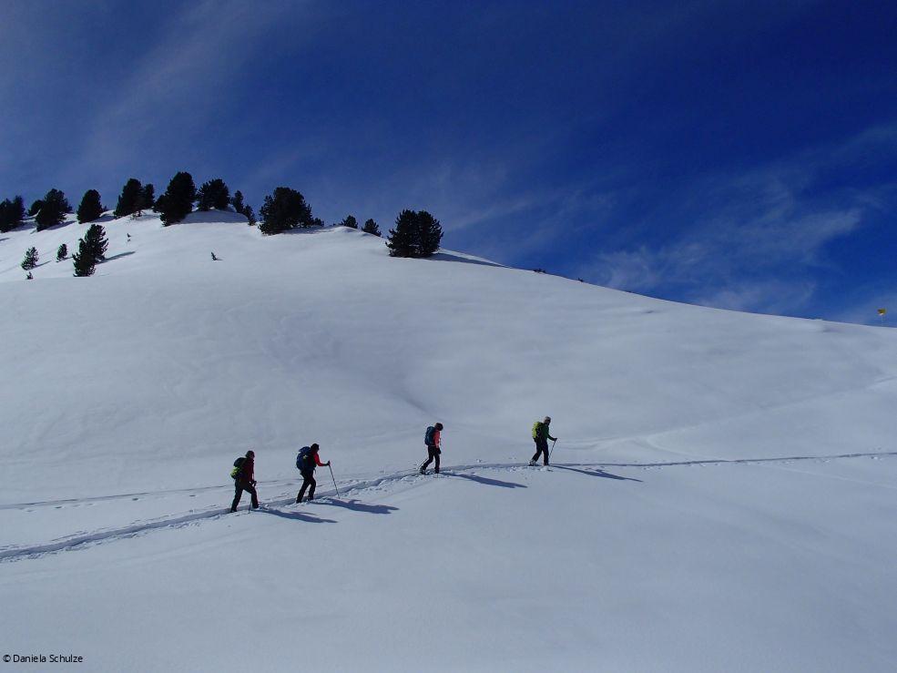Am Samstag starteten wir unsere Schneeschuhtour im überwiegend unberührten Neuschneegelände über die Adolf-Pichler-Hütte zum Sonntagsköpfl (2.096m). Begleitet wurden wir von herrlichem Sonnenschein und phantastischen Bergaussichten.
