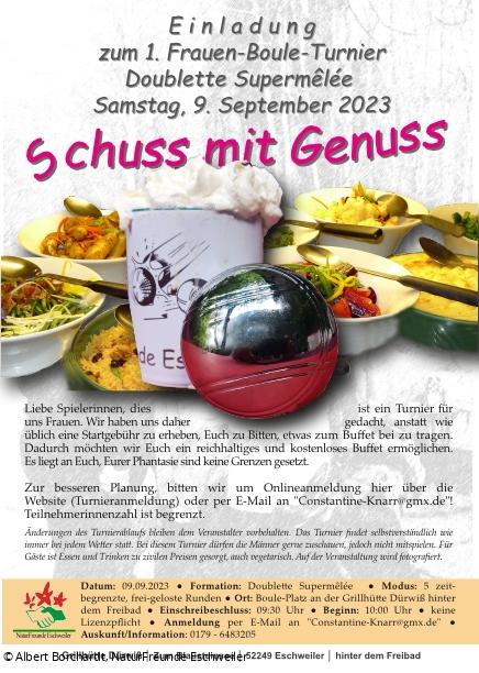 Datum: 09.09.2023 ● Formation: Doublette Supermêlée ● Modus: 5 zeit-begrenzte, frei-geloste Runden ● Ort: Boule-Platz an der Grillhütte Dürwiß hinter dem Freibad ● Einschreibeschluss: 09:30 Uhr ● Beginn: 10:00 Uhr ● keine Lizenzpflicht ● Anmeldung per E-Mail an "Constantine-Knarr@gmx.de" ● Auskunft/Information: 0179 - 6483205