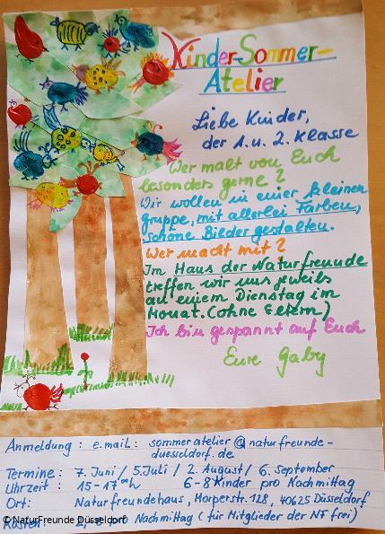Jeweils am ersten Dienstag in den Monaten Juni bis September ab 15:00 Uhr (Dauer ca. 2 Stunden) können sich interessierte Kinder (ohne ihre Eltern) im Naturfreundehaus Gerresheim treffen, um sich gemeinsam mit der Erzieherin und Kunstpädagogin Gaby Schulz im Malen auszuprobieren.